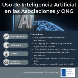 La inteligencia artificial se está incorporando al Tercer Sector y está transformando la forma en que las entidades comunican y gestionan tareas. Sin embargo, muchas asociaciones aún desconocen sus posibilidades o no cuentan con criterios claros para utilizarla. Este curso mostrará herramientas y aplicaciones prácticas de la IA, al tiempo que propone una reflexión crítica para promover un uso útil, seguro y responsable en las organizaciones.
